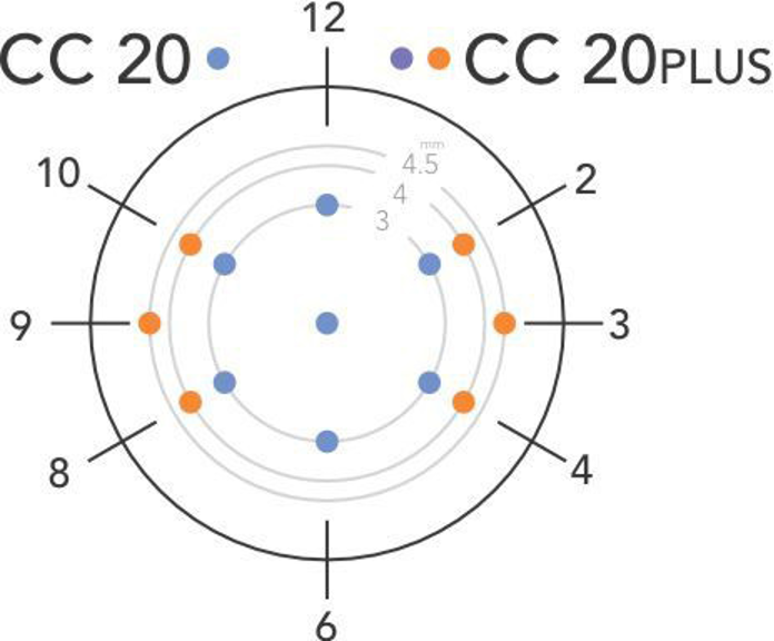 Seri içerisinde yer alan CellChek® 20 PLUS modeli, kornea merkezinden 4.5 mm’ye kadar uzanan toplam 13 sabitleme noktası ile daha geniş alanlı endotel değerlendirmesi imkânı sunar.