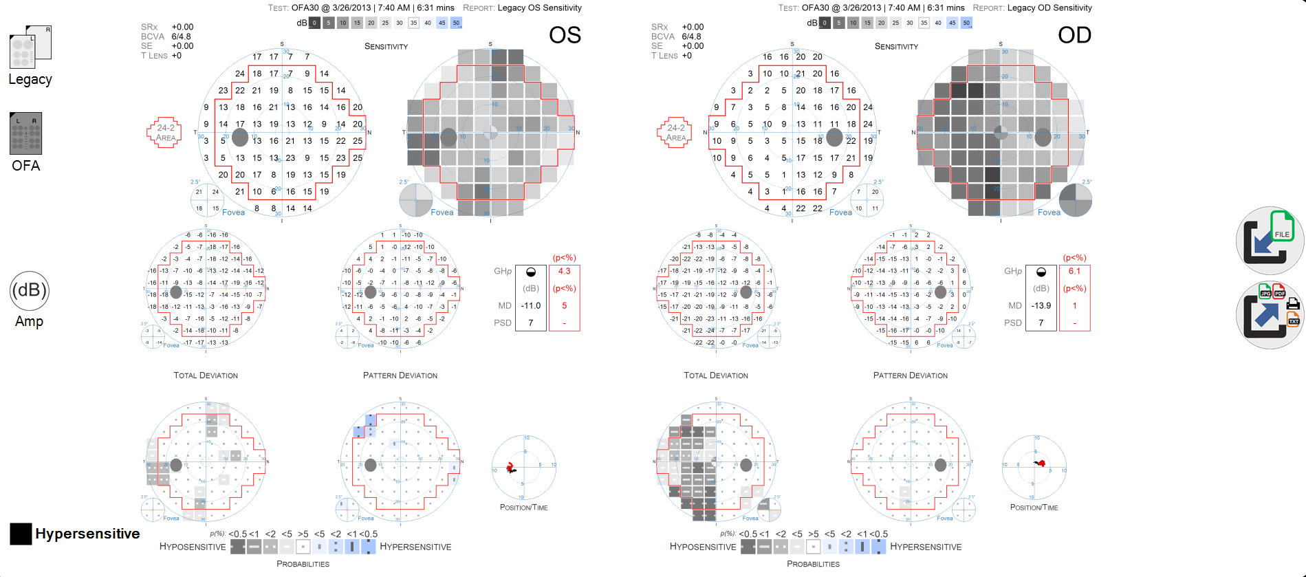OFA, 30° ve 24° (birlikte), 15° ve 10° için test protokollerini içerir. OFA 30 test protokolü, ek bir test süresine ihtiyaç olmaksızın, aynı anda ve aynı rapor içerisinde 24-2 bölgesinin değerlendirilmesini sağlar. Bunun nedeni, 30° görme alanının test edilmesinin 24° testine kıyasla ek bir süre gerektirmemesidir.