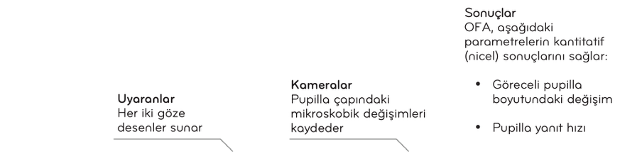 Görsel uyaranlar, görme alanının farklı noktalarında ve bilateral olarak sunulur. İncelenen alanın %99’undan fazlasının örneklenmesiyle elde edilen pupiller yanıtlar, görme alanı fonksiyonuna ait ayrıntılı bir “harita” oluşturulmasını sağlar.